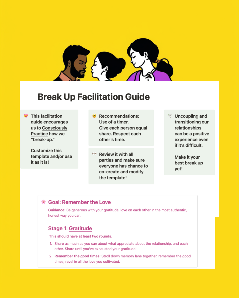 Breakups don’t have to be devastating. The Breakup Facilitation Guide is a powerful tool designed to help couples transition their relationships with respect and care. It walks you through every step of the uncoupling process, creating a space to express gratitude, process emotions, gain clarity, and set healthy boundaries for the future.