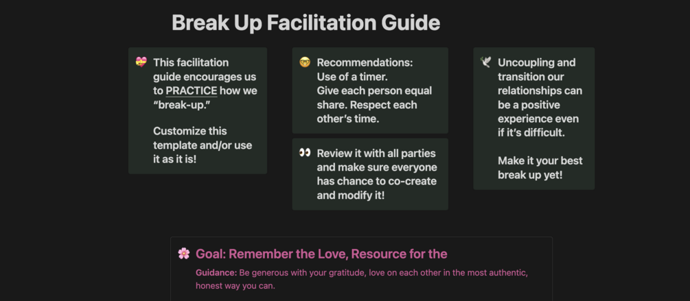 Breakups don’t have to be devastating. The Breakup Facilitation Guide is a powerful tool designed to help couples transition their relationships with respect and care. It walks you through every step of the uncoupling process, creating a space to express gratitude, process emotions, gain clarity, and set healthy boundaries for the future.
